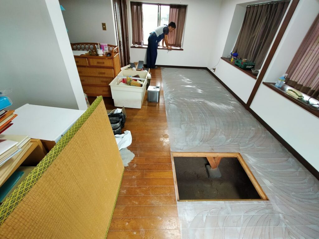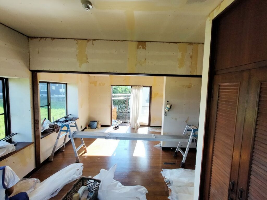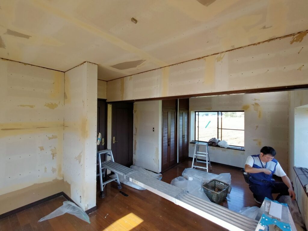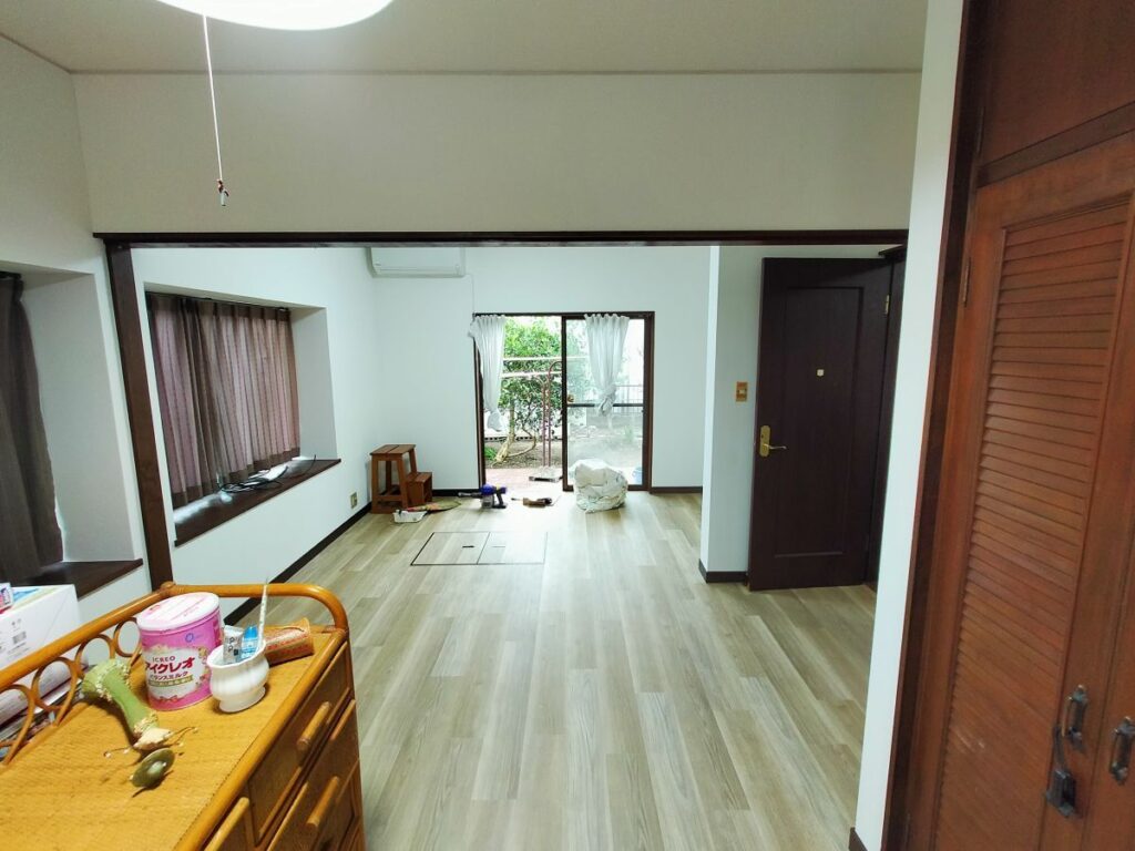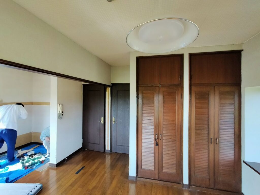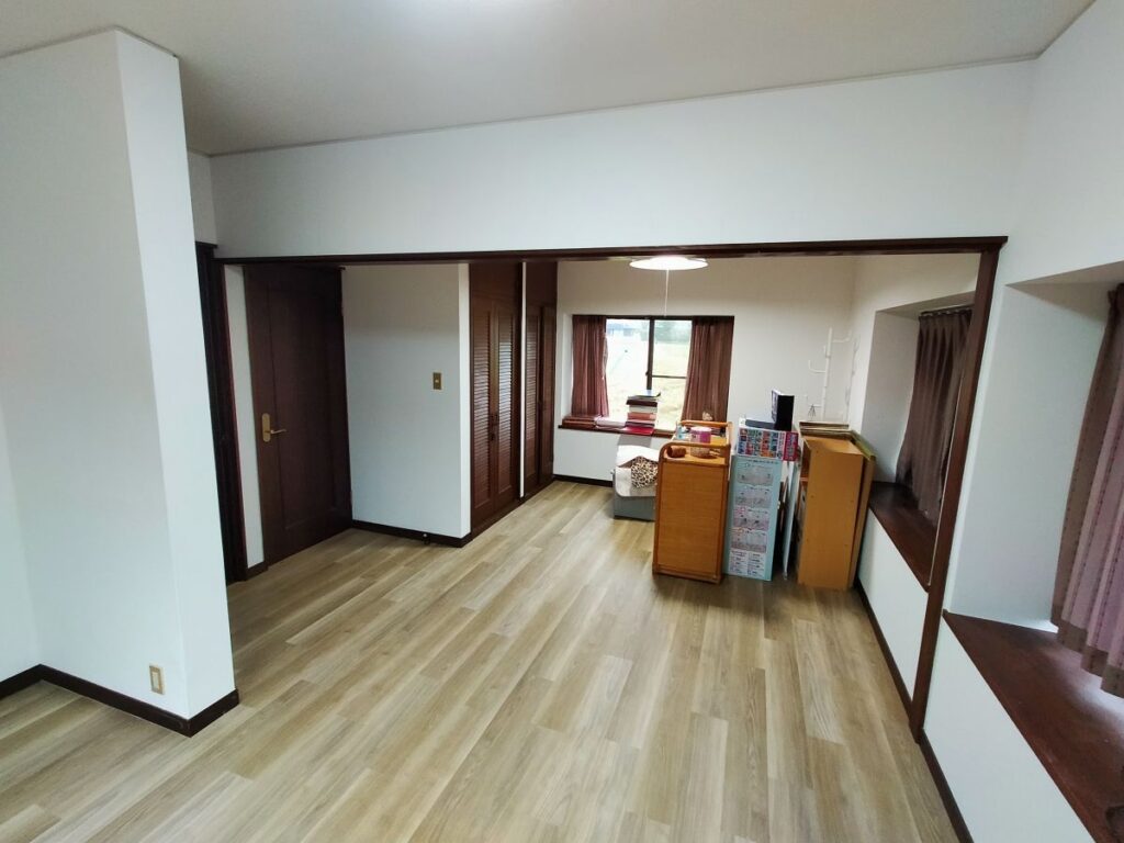 熊本県玉名市にお住いのお客様が子供のころに住まれていたご実家に戻られ居室として使いたいので、天井と壁の壁紙と床を綺麗にしたいとご依頼がありました。