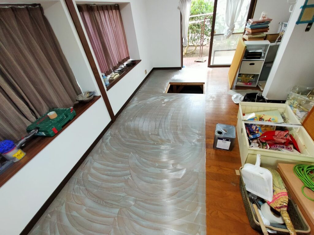 クロス張替が完了し、床フロアタイルの接着剤を塗布している状況です。