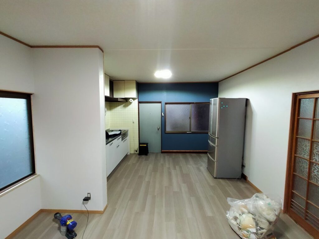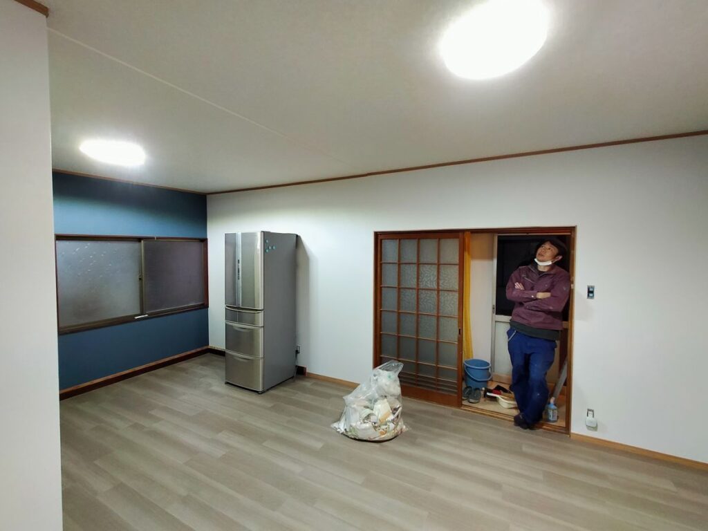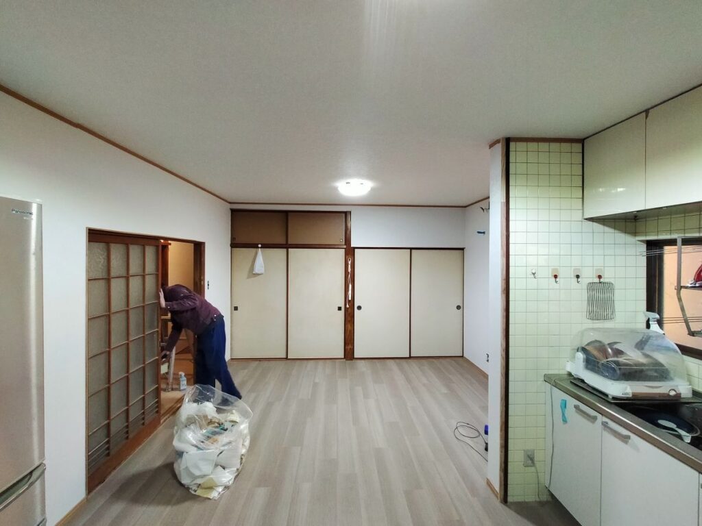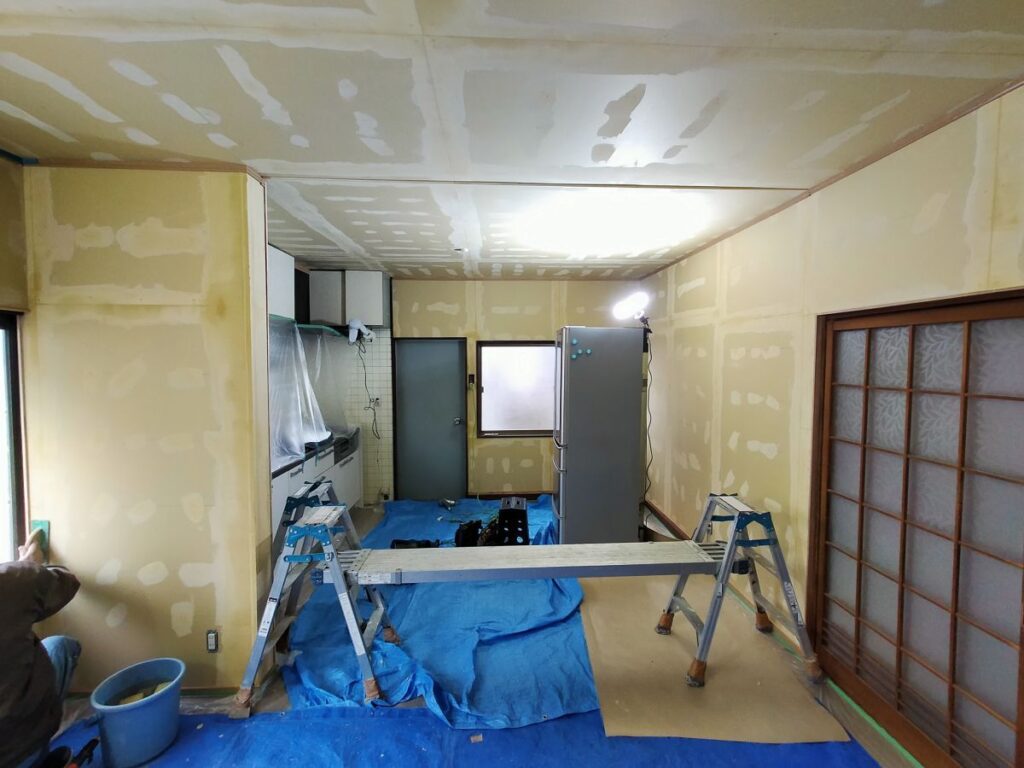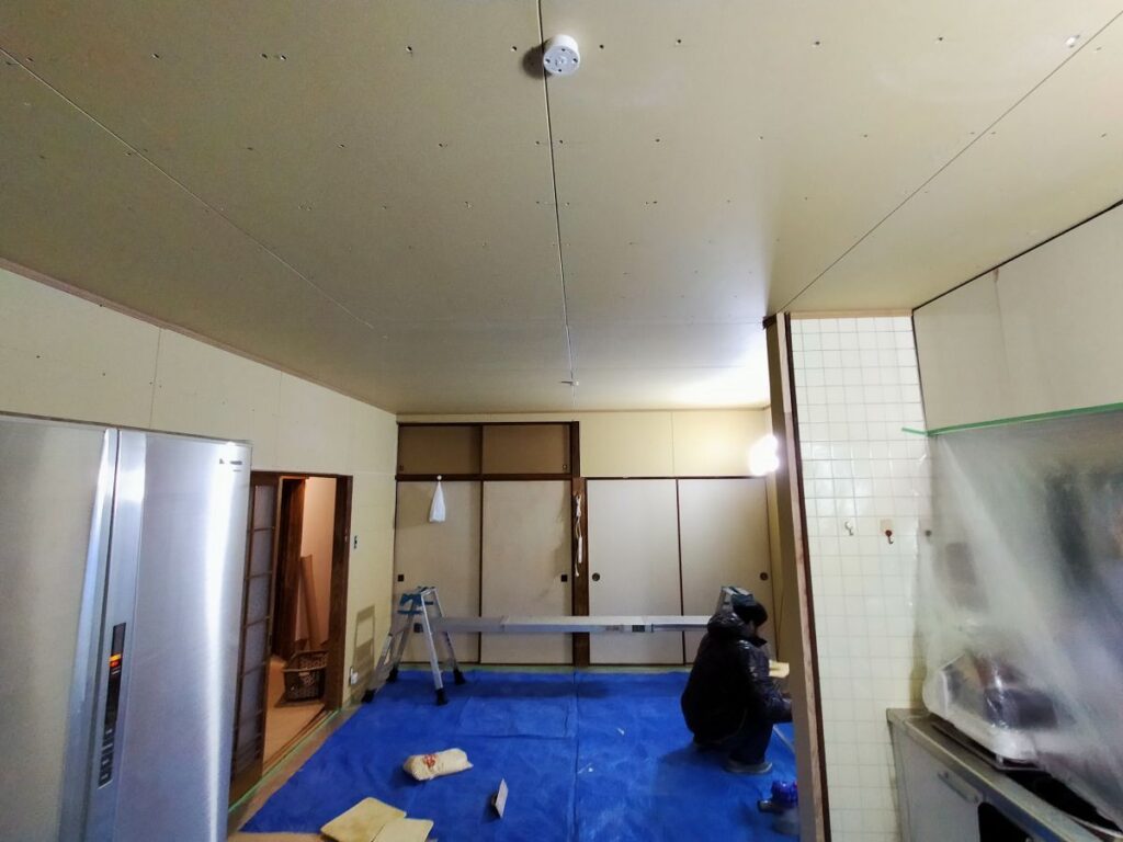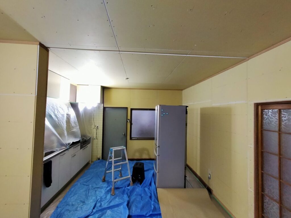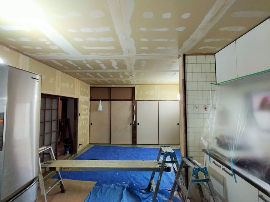 その後は大工さんにて和室の天井をDKと繋げ、和室の壁を大壁造りにしていただいた上で、弊社にてクロス張りを仕上げていきます。