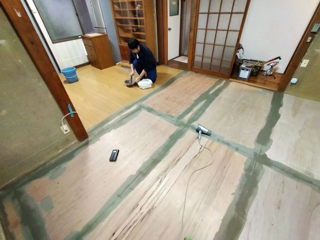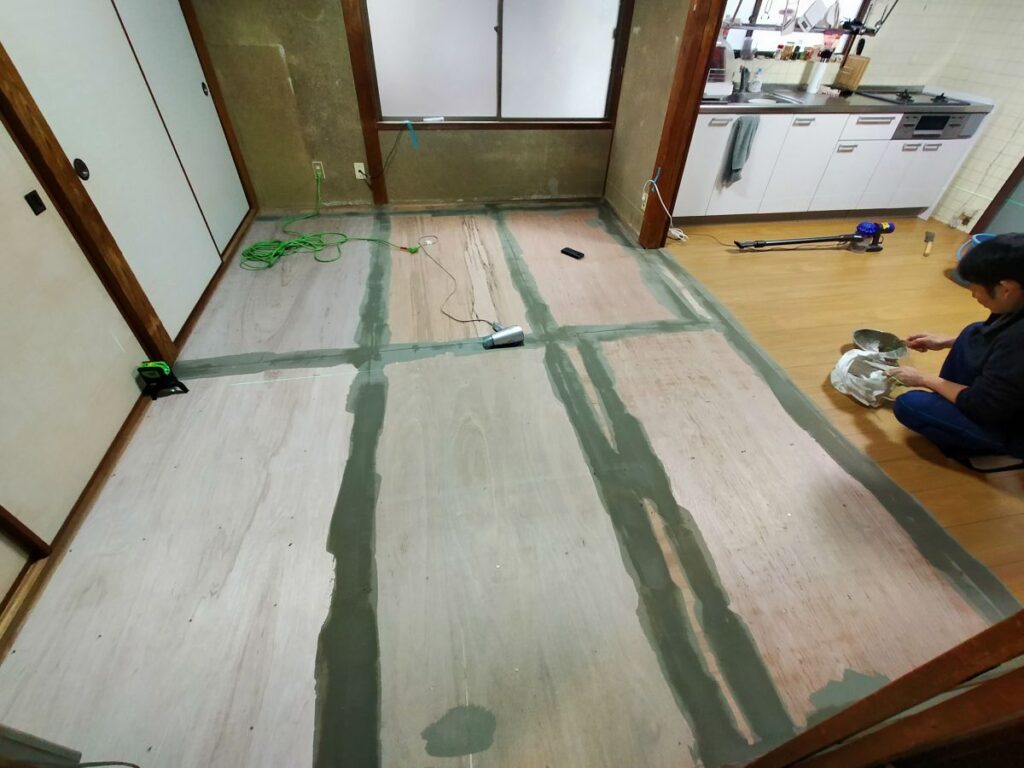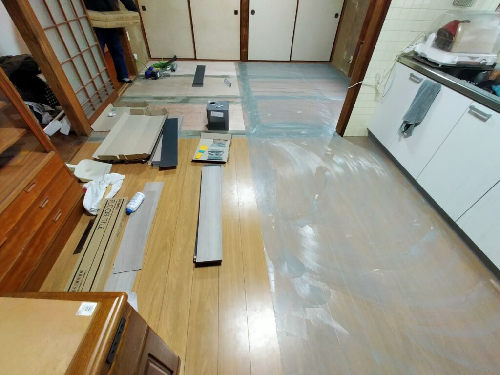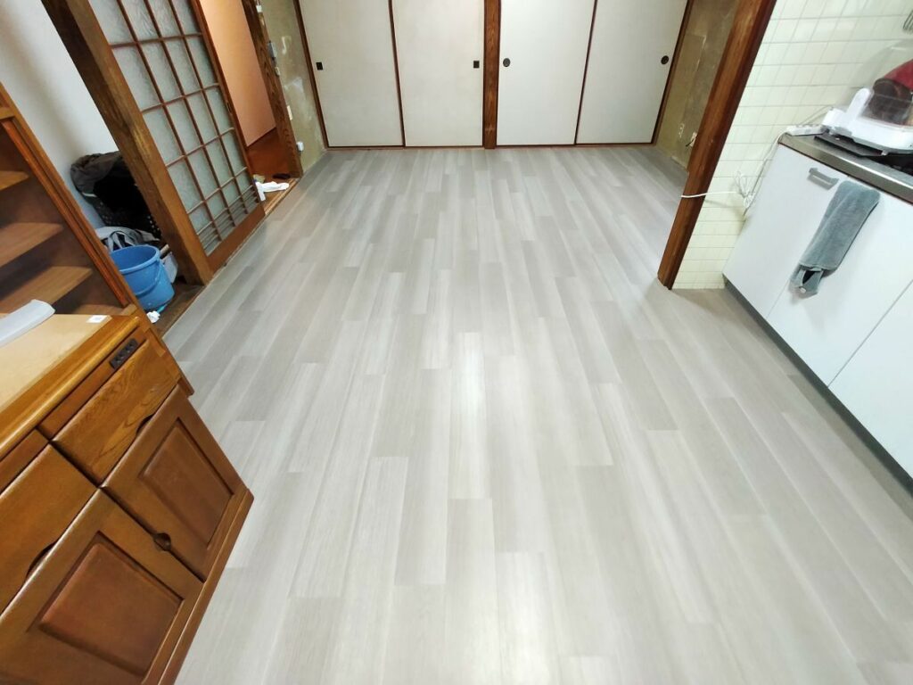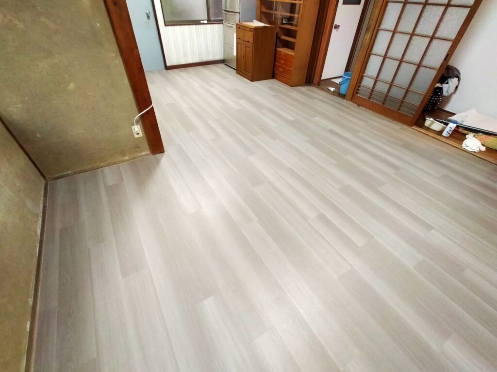 別途大工さんにて和室を畳からベニヤ作り(DKと旧和室床はフラット)へ変更していただき、弊社にて床フロアタイル張りを仕上げていきます。